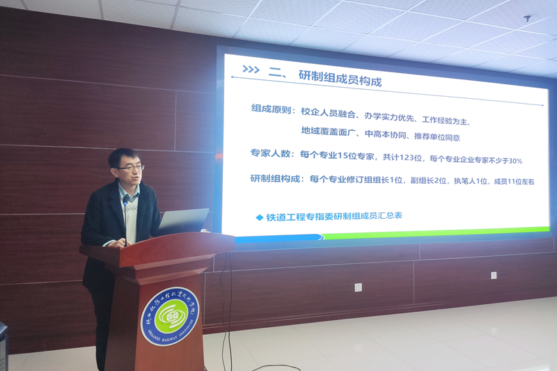 10月15日,全国铁道行指委铁道工程专业教学指导委员会专业简介和专业教学标准修(制)定工作培训会在我校高新校区北三楼会议室召开。负责专业简介和专业教学标准修(制)订工作的广铁职院、郑铁职院、石铁职院、辽铁职院等院校的23位代表,以及学校教务处、高铁工程学院、测绘与检测学院、铁道运输学院、铁道动力学院、铁道装备制造学院、工程管理与物流学院等20余名领导和老师参会,高铁工程学院院长赵东主持会议。