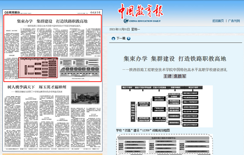 11月1日,《中国教育报》第8版刊发了学校王津书记、焦胜军校长的署名文章《集束办学 集群建设 打造铁路职教高地》。文章系统介绍了学校“双高”建设理念、目标与特色,以及取得的阶段性成果。现将全文转载如下: