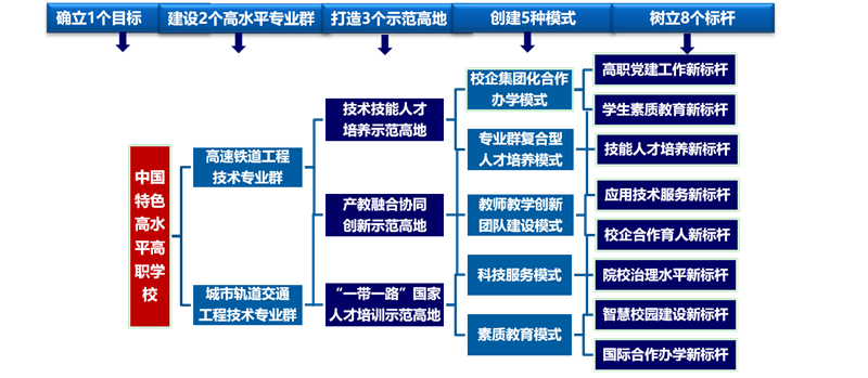 陕西铁路工程职业技术学院坚持依托铁路行业办学,突出铁路特色育人,服务国家“一带一路”倡议和高铁“走出去”战略,对接铁路产业发展和技术升级,锚定高铁和城轨产业高端,以立德树人为根本任务,以专业群建设为核心,以师资队伍建设为关键,以技术创新为驱动,以产教融合为抓手,以体制机制改革为动力,紧紧围绕“一加强、四打造、五提升”的十项改革发展任务,按照“高起点设计、高标准建设、高质量发展”的建设思路,打造“12358”标杆院校,通过实施“建平台、树标杆、筑高峰”三步走战略,建成“引领改革、支撑发展、中国特色、世界水平”的“支撑高铁建设,铸就筑路先锋”高水平高职学校。