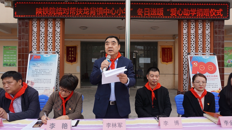 李艳主任表示,赠人玫瑰,手有余香,陕铁院结对帮扶我们龙背中心小学,感谢陕铁院关心农村基层教育事业,关注留守儿童。学校将积极引导学生心怀感恩。她勉励教职工尽职尽责,为经开区的教育质量付出贡献。鼓励学生努力学习,刻苦钻研,掌握科学文化知识,改变自身命运,改变家庭和家乡的面貌。