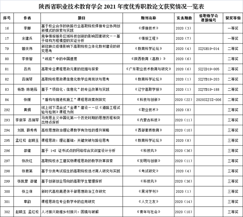 近日,陕西省职业技术教育学会下发《关于公布2021年度优秀职教论文评选结果的通知》(陕职学〔2021〕98号),学校共有19篇论文获奖,其中一等奖2篇、二等奖6篇、三等奖11篇。