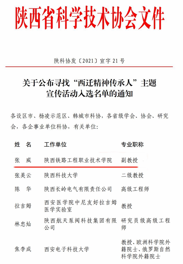 今年6月开始,中共陕西省委宣传部、陕西省科学技术协会共同开展寻找“西迁精神传承人”主题宣传活动并发布活动通知。学校积极寻找西迁精神传承人,动员符合条件的优秀科技工作者积极申报。经个人申报、科技处审查、学校报送、渭南市推荐等环节,最终学校马克思主义学院教师张威被确定为“西迁精神传承人”。本次入选要求较高、难度较大,并且要求有赓续西迁精神的相关经历。