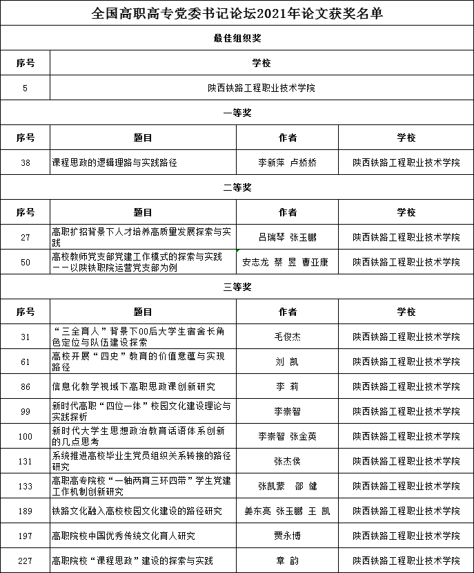 全国高职高专党委书记论坛2021年论文征集活动于今年5月至8月举行,共收到论文794篇。全国高职高专党委书记论坛学术委员会聘请20位评委,按照全国高职高专党委书记论坛2021年论文评选标准,秉着公平公正的原则,对参评论文进行了评审,共评选出获奖论文486篇,其中一等奖论文92篇,二等奖论文148篇,三等奖论文246篇;学校等7所院校为2021年论文征集活动最佳组织奖。