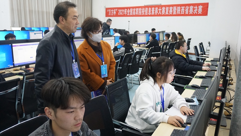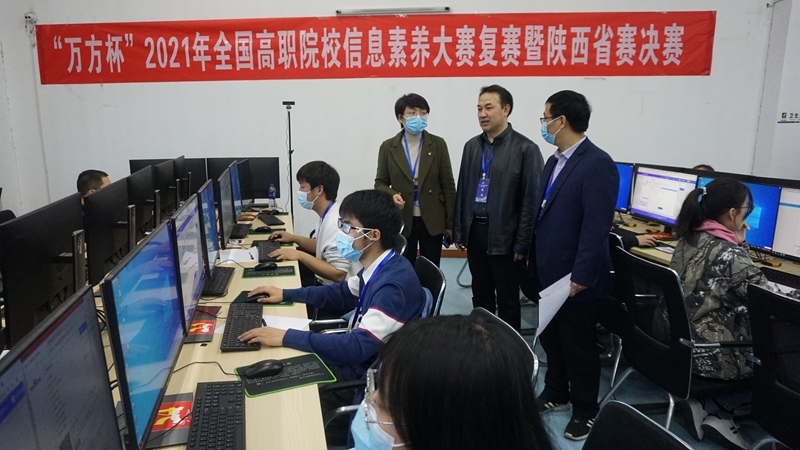 上午10点,比赛正式开始,考场严格按照防疫要求隔位就坐,陕西赛区34名参赛选手上机考试展开比拼。赛场上,选手们沉着冷静,发挥稳定。王丁、袁素瑛、侯党社等巡视考场,技术人员及考场考务人员全程陪同,确保大赛顺利进行。