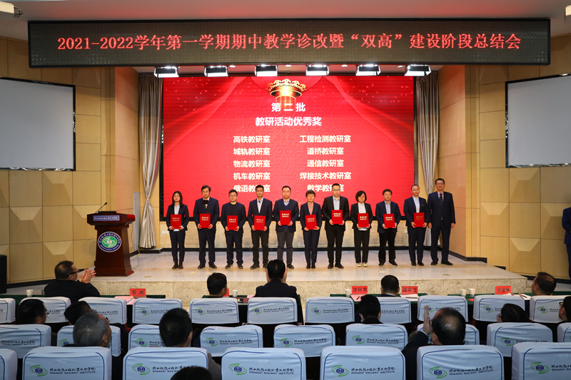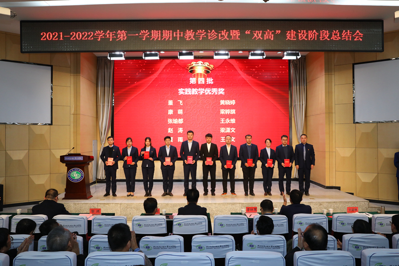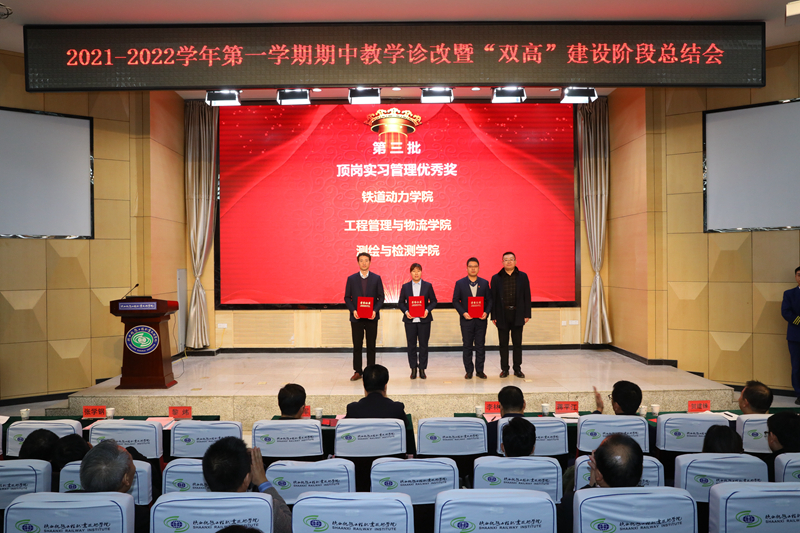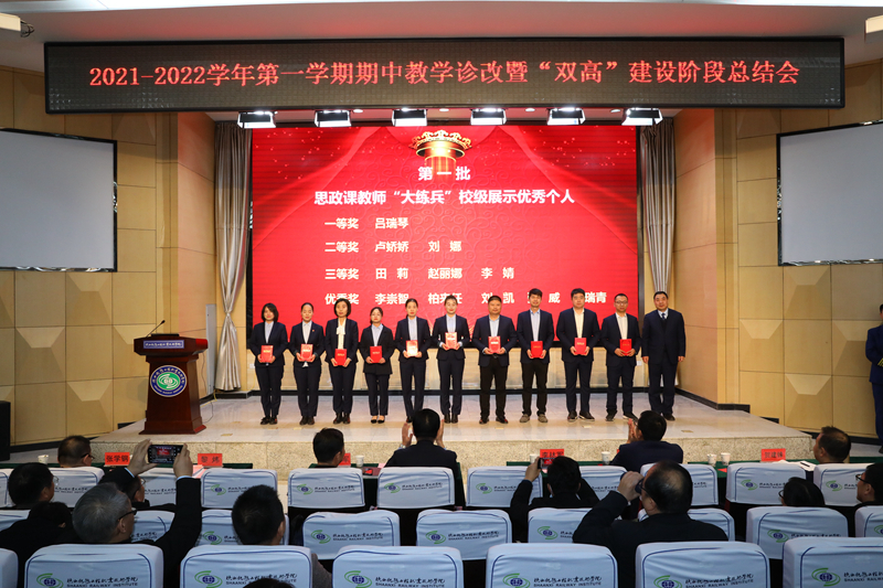 贺建锋宣读了《关于表彰2021-2022学年第一学期期中教学诊断与改进优秀项目的决定》和《关于表彰学校2021年思政课教师“大练兵”校级展示获奖个人的决定》,与会领导为先进部门和个人进行了颁奖。