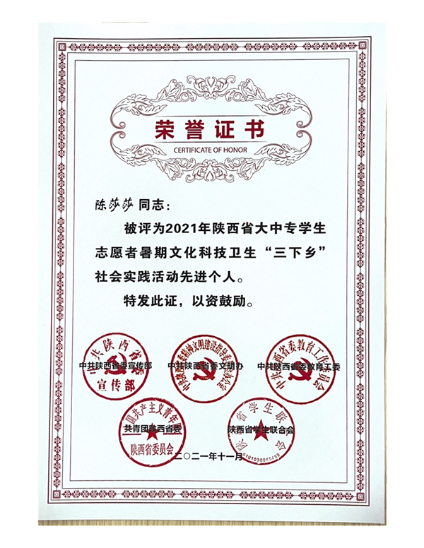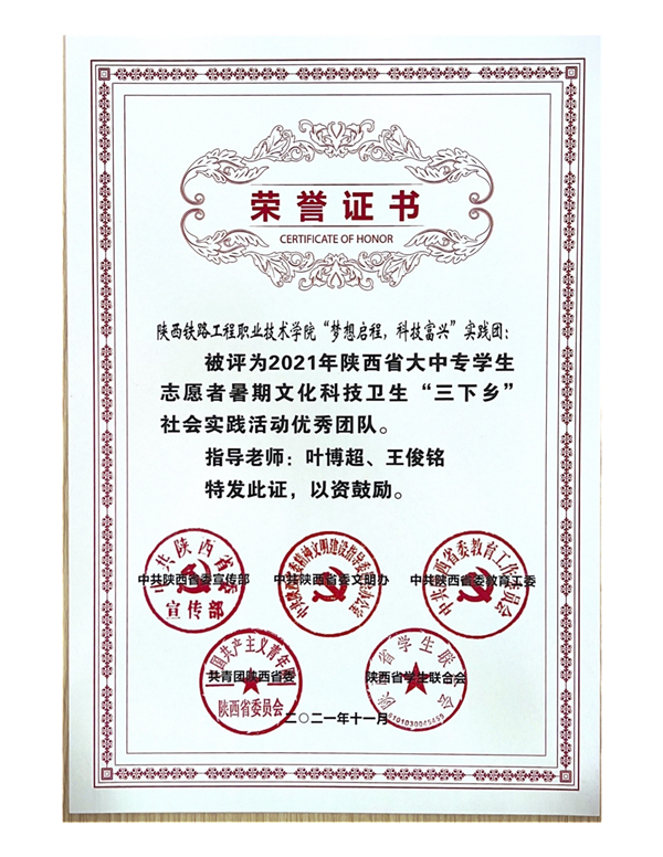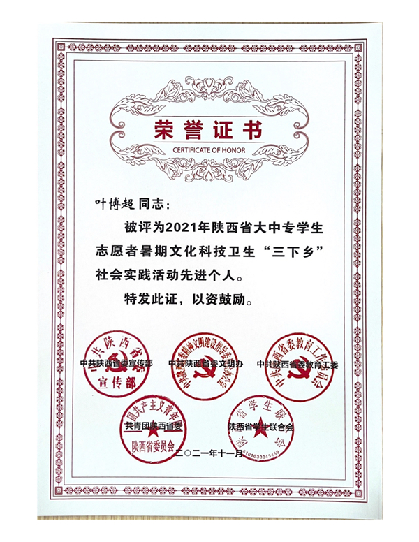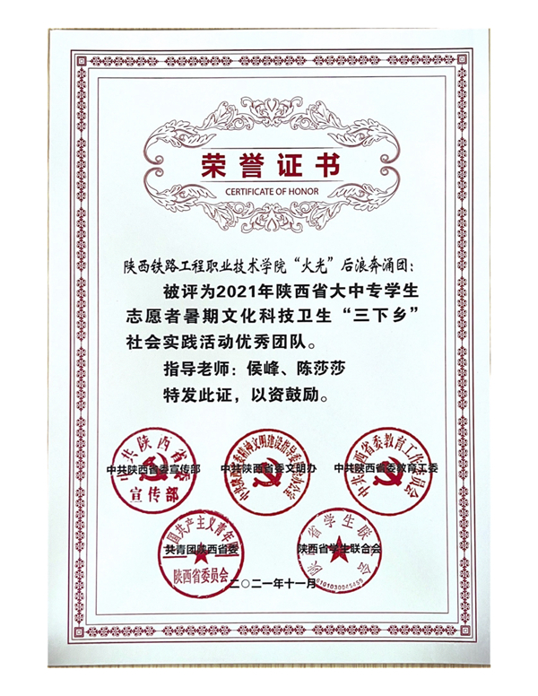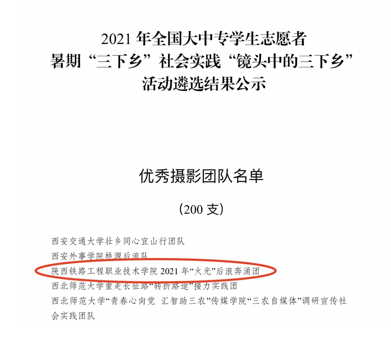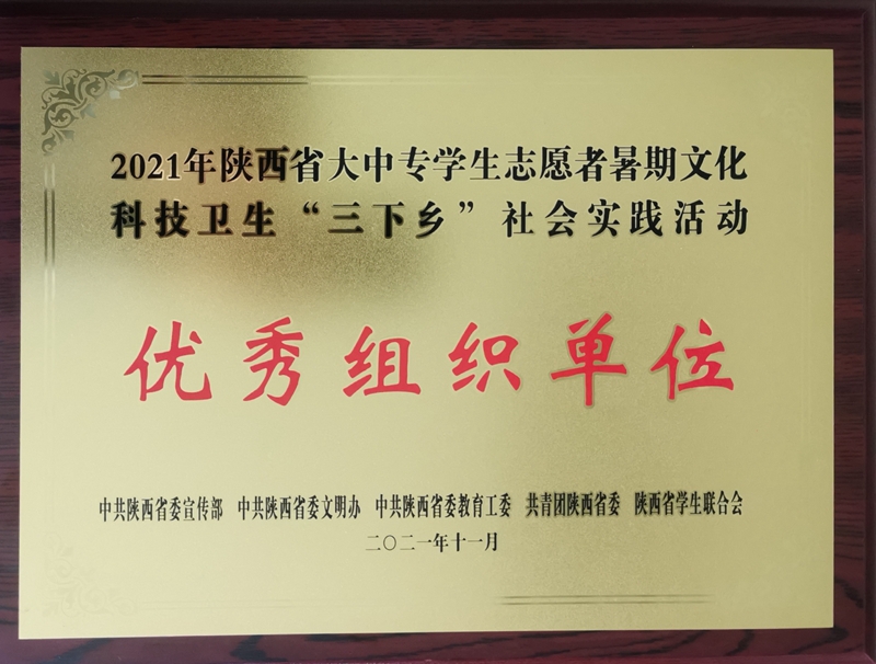 近日,中共陕西省委宣传部、中共陕西省委教育工委、共青团陕西省委、中共陕西省委文明办、陕西省学生联合会联合下发了《关于在疫情防控常态化形势下开展2021年陕西省大中专学生志愿者暑期文化科技卫生“三下乡”社会实践活动的通知》(陕团联发〔2021〕23号)文件,在2021年陕西省大中专学生志愿者暑期文化科技卫生“三下乡”社会实践活动中,学校组织了161名师生,共计17支实践团队深入革命老区、农村地头、企业社区开展社会实践并取得出色成绩。学校荣获省级优秀组织单位;“火光”后浪奔涌团、“梦想启程,科技富兴”实践团荣获省级优秀团队;叶博超,陈莎莎老师荣获先进个人;火光”后浪奔涌团获2021年全国大中专学生志愿者暑期“三下乡”社会实践“镜头中的三下乡”活动优秀摄影团队。