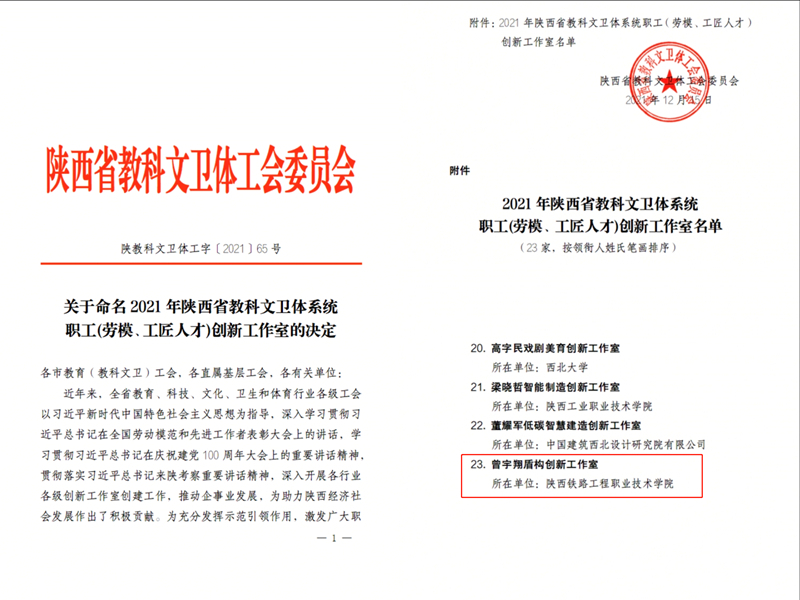 12月15日,陕西省教科文卫体工会委员会发布《关于命名2021年陕西省教科文卫体系统职工(劳模、工匠人才)创新工作室的决定》文件,学校“曾宇翔创新工作室”获批命名,并获得3万元建设资金支持,全省共23家。