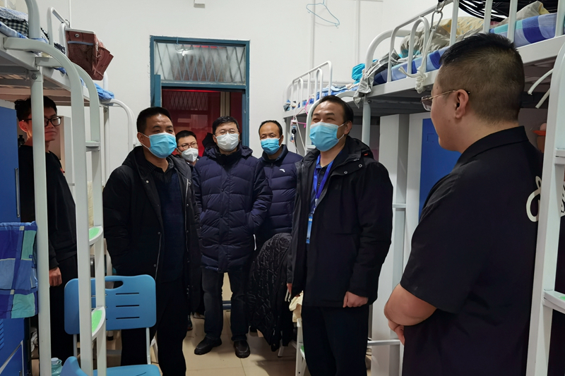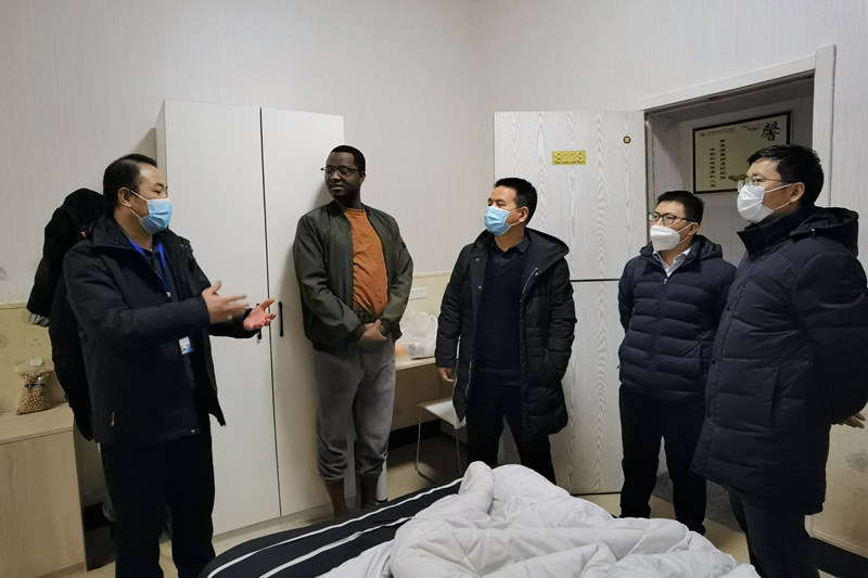 天冷情更暖,上下一条心!元月三日晚,凛冽寒风中,贺建锋副校长带领党委(校长)办公室、学生处、国际与合作交流处、国际交通学院、铁道动力学院、铁道运输学院等部门负责人和留校值班的党员先锋队深入临渭校区学生公寓,和中外学生们共话疫情防控。