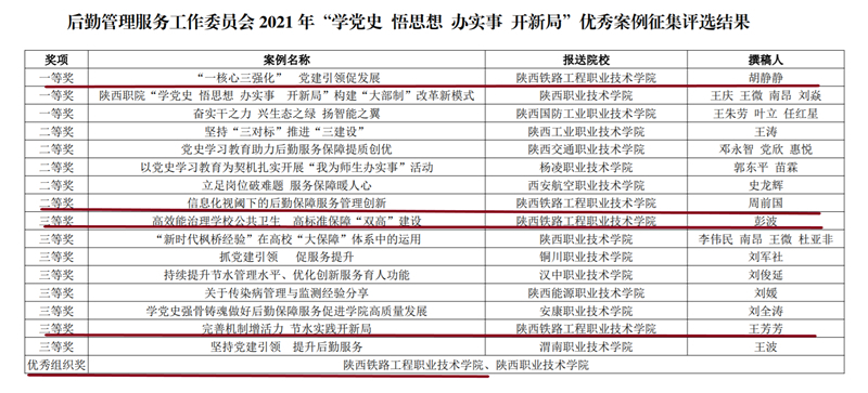 近日,陕西省职业技术教育学会印发《关于公布后勤管理服务工作委员会2021年“学党史、悟思想、办实事、开新局”优秀案例评选结果的通知》(陕职学〔2021〕136 号),学校获优秀组织奖,后勤保障处胡静静撰写的《“一核心三强化” 党建引领促发展》获一等奖,周前国撰写的《信息化视阈下的后勤保障服务管理创新》获二等奖,彭波撰写的《高效能治理学校公共卫生高标准保障“双高”建设》和王芳芳撰写的《完善机制增活力节水实践开新局》获三等奖。