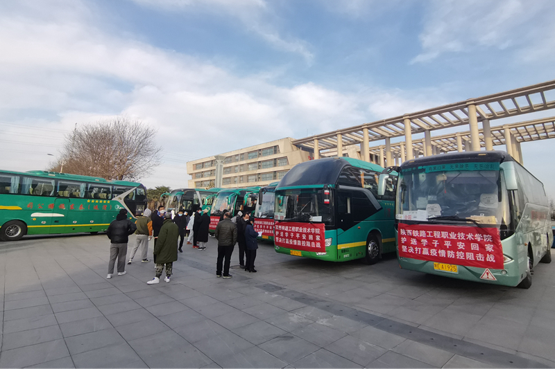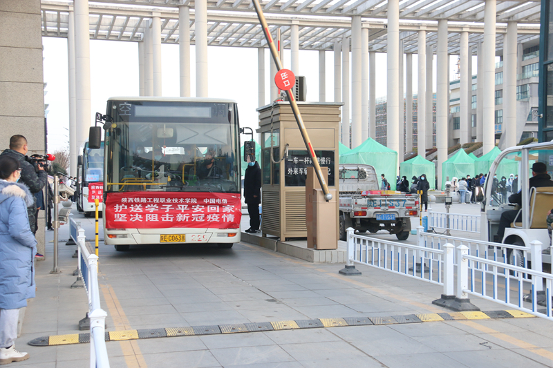1月13日上午,学校两校区停了近40辆大巴车,车头均挂着“陕西铁路工程职业技术学院护送学子平安回家,坚决打赢疫情防控阻击战”横幅,铁院学子将乘坐这次的暖心专车回家。