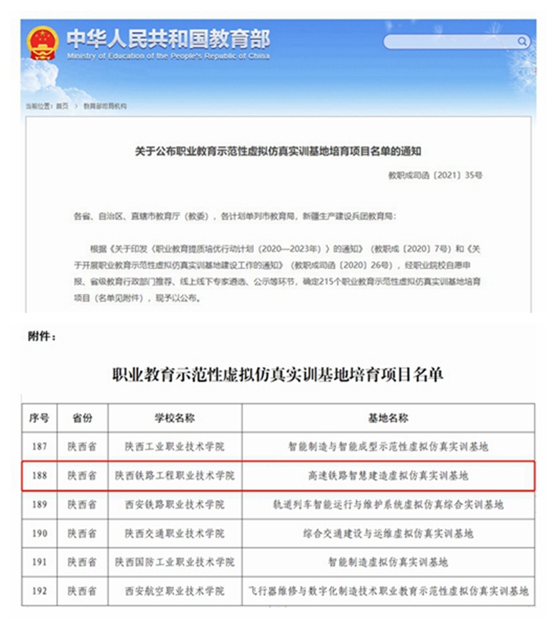 第一项:高速铁路智慧建造虚拟仿真实训基地入选全国第一批职业教育示范性虚拟仿真实训基地培育项目。