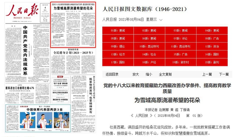 8月4日,《人民日报》头版刊发了《党的十八大以来教育援藏助力西藏改善办学条件、提高教育教学质量》文章,对我校毕业生崔创军助力西藏拉林铁路建设事迹进行了报道。