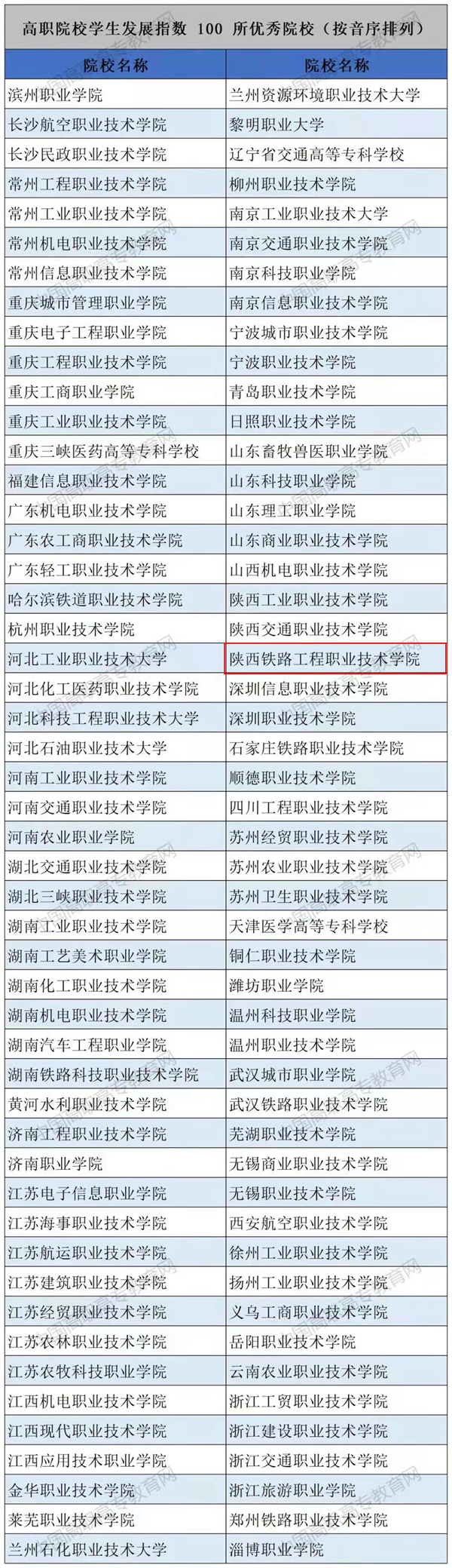 2月14日,全国职业高等院校校长联席会议公布高职院校学生发展指数优秀院校名单,全国共有100所学校入选,陕铁院位列其中。