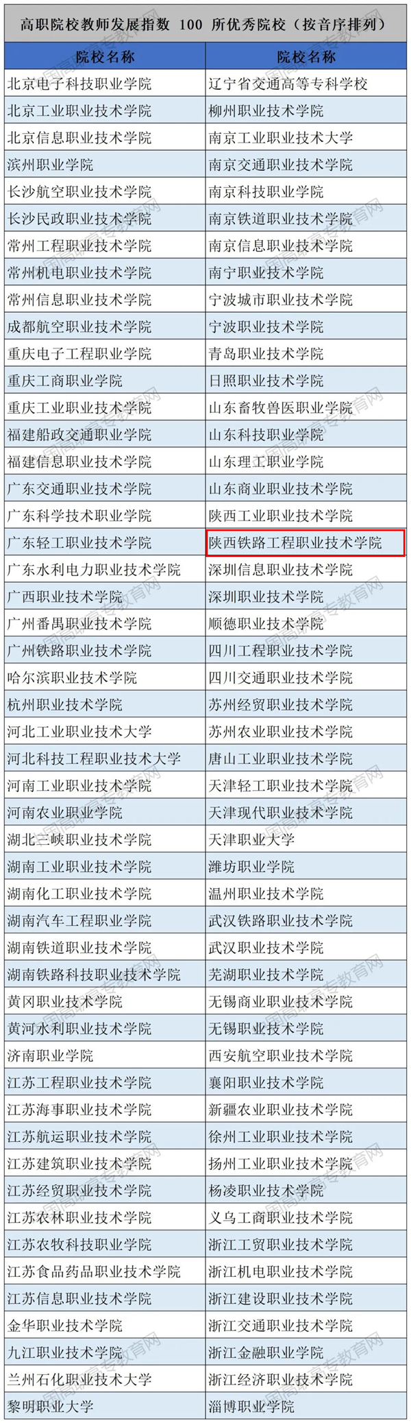 2月15日,全国职业高等院校校长联席会议公布高职院校教师发展指数优秀院校名单,100所高职院校入选,陕铁院位列其中。