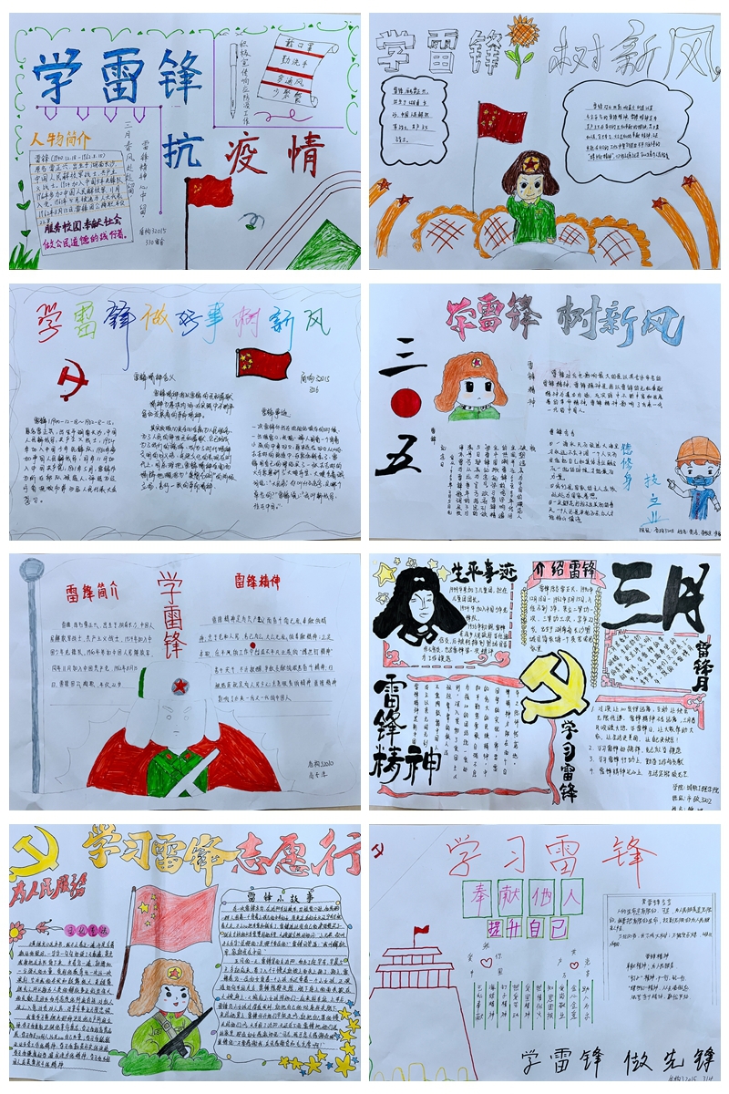本次手抄报以“学雷锋”为主题,通过绘画、摘录等各种形式,描绘雷锋肖像、介绍雷锋事迹、摘录《雷锋日记》、展现身边的雷锋等,从各个方面宣扬雷锋精神,把对雷锋的崇敬和怀念之情深深融入到手抄报创作之中,追述雷锋同志的光辉事迹。参赛作品版面设计新颖、内容丰富、图文并茂、形式风格各异,体现了学生活跃的思维和创新的动手能力。通过本次活动,同学们深刻地学习到雷锋精神的内涵,体会雷锋精神的意义,用实际行动践行雷锋精神,为建设美丽校园奉献一份爱心。(孙喜文)