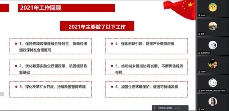 王津书记在总结讲话中指出,要迅速掀起“两会”精神学习宣传的热潮,把学习贯彻“两会”精神和做好学校2022年各项重点工作结合起来。要以“两会”精神学习为契机,进一步深入学习贯彻党的十九届六中全会精神,深刻学习领会“两个确立”的决定性意义和习近平总书记关于党的百年奋斗重大成就和历史经验的重要论述。要将学习成果转化为工作动力,助推学校各项事业发展,以更加昂扬的精神面貌迎接党的二十大胜利召开。