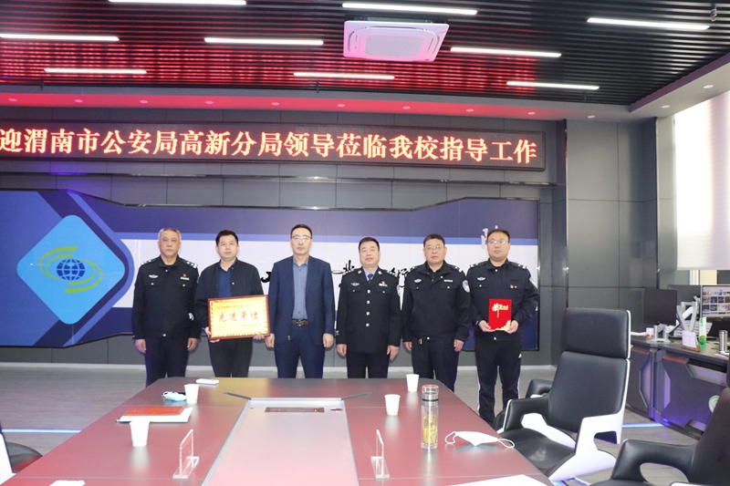 3月30日上午,渭南市公安局高新分局国保大队大队长郭夏率大队民警蒋建军、马思海赴学校开展“送奖到基层”活动,学校副校长祝和意、安保处处长李晓飞、安保处治安科科长吕潇出席活动。