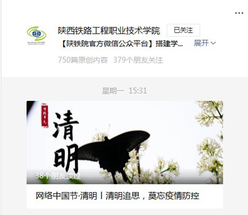 为更好传承中华传统文化,推进网络文明建设,各二级学院充分利用新媒体平台,围绕祭奠先祖、缅怀英烈、孝亲感恩等主题,开展了“云上祭扫”“追秀先烈足迹”等活动,推出清明风俗、缅怀先烈等推文,引导学生传承弘扬中华优秀传统文化、革命文化和社会主义先进文化。