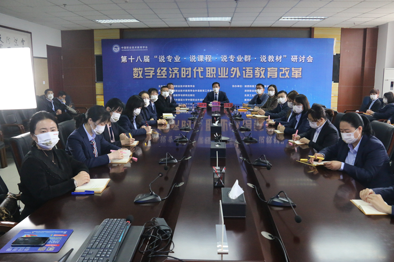 第十八届“说专业•说课程•说专业群•说教材”研讨会于4月15日上午举行,本次研讨会由中国职业技术教育学会主办,通过线上线下两种方式同时举行,在线下设有北京和陕西两个分会场,陕西分会场设在学校。本次研讨的主题是“数字经济时代外语教育改革”。会议分为三部分:第一部分是学会领导做主旨报告、主题报告;第二部是专题分享报告;第三部分是中职和高职共43所院校做教学创新案例展示。