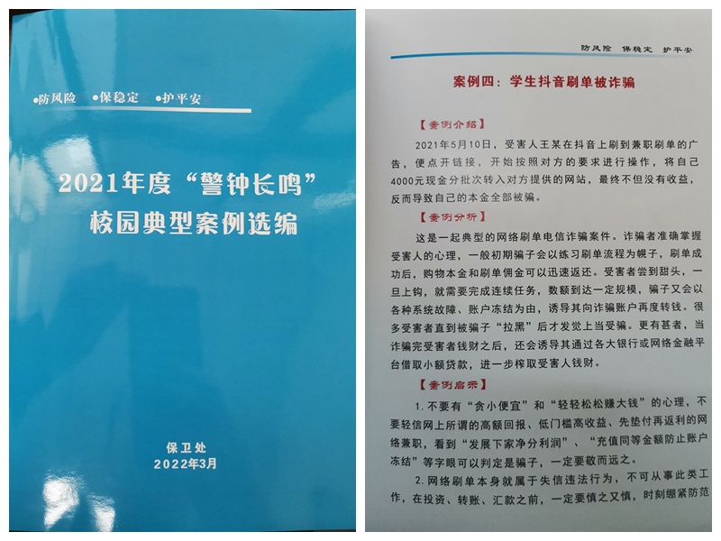 近日,学校安全保卫处收集整理了2021年度对学生伤害较大,影响面较广的十一件校内典型案例,编印成《2021年度“警钟长鸣”校园典型案例选编》并赠送给学校各二级学院学管老师。学校各二级学院高度重视《2021年度“警钟长鸣”校园典型案例选编》的教育警示作用,利用晚自习纷纷召开典型案例警示教育主题班会,充分发挥小册子的大作用,用身边的“活教材”频敲“警示钟”’!