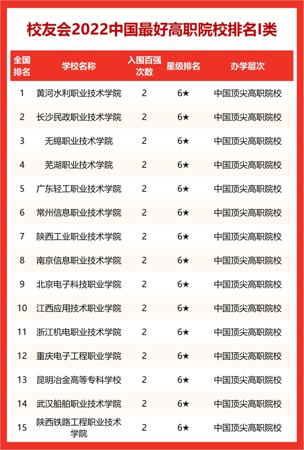 4月15日,艾瑞深校友会网公众号公布了校友会2022中国最好高职院校排名,学校入选校友会2022中国最好高职院校排名Ⅰ类名单。