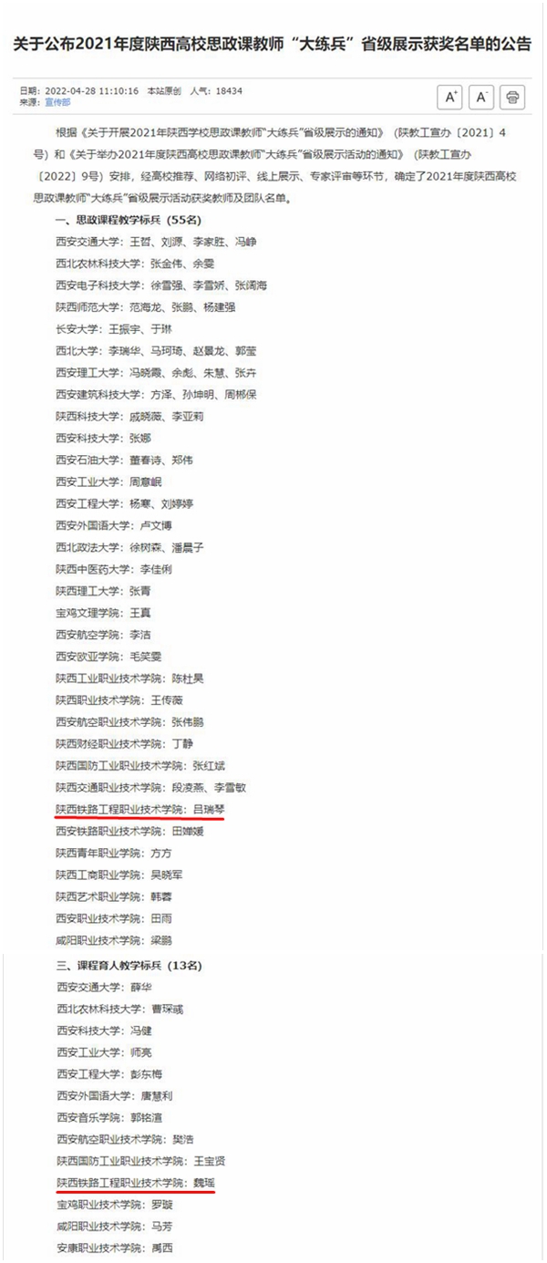4月28日,中共陕西省委教育工委、陕西省教育厅公布2021年度陕西高校思政课教师“大练兵”省级展示获奖名单,学校教师再创佳绩,马克思主义学院教师吕瑞琴获思政课程“教学标兵”荣誉称号,测绘与检测学院教师魏瑶获课程育人“教学标兵”荣誉称号。