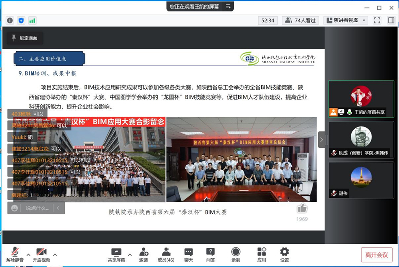 在职教周活动的首日,BIM中心资深BIM建模师王凯老师推出一场精彩的线上讲座,吸引了校内爱好创新技术应用的同学线上聆听。王凯从BIM技术应用研究情况给同学们展示了该技术在国内国外的发展状况,同时列举国内推广应用的政策环境以及学校率先成立BIM技术应用研究中心的举措,为同学们打开了一扇身边新技术应用的窗户。在讲座中王凯还结合丰富的案例和各类赛事获奖情况详细讲解了BIM技术的主要应用价值点。最后他深度阐述了BIM技术的发展趋势:应用自主可控的BIM技术,加快构建数字设计基础平台和集成系统,实现设计、工艺、制造协同;BIM技术与互联网、物联网、大数据、云计算、人工智能、区块链等新技术的集成与创新应用价值;信息技术与建筑业的深度融合将实现从设计、施工到运维的数字化交付和全寿命期信息共享实现提质增效、节能减排。讲座深入浅出的讲解,以及生动的案例图片引起同学们广泛共鸣,为职教周活动拉开序幕。