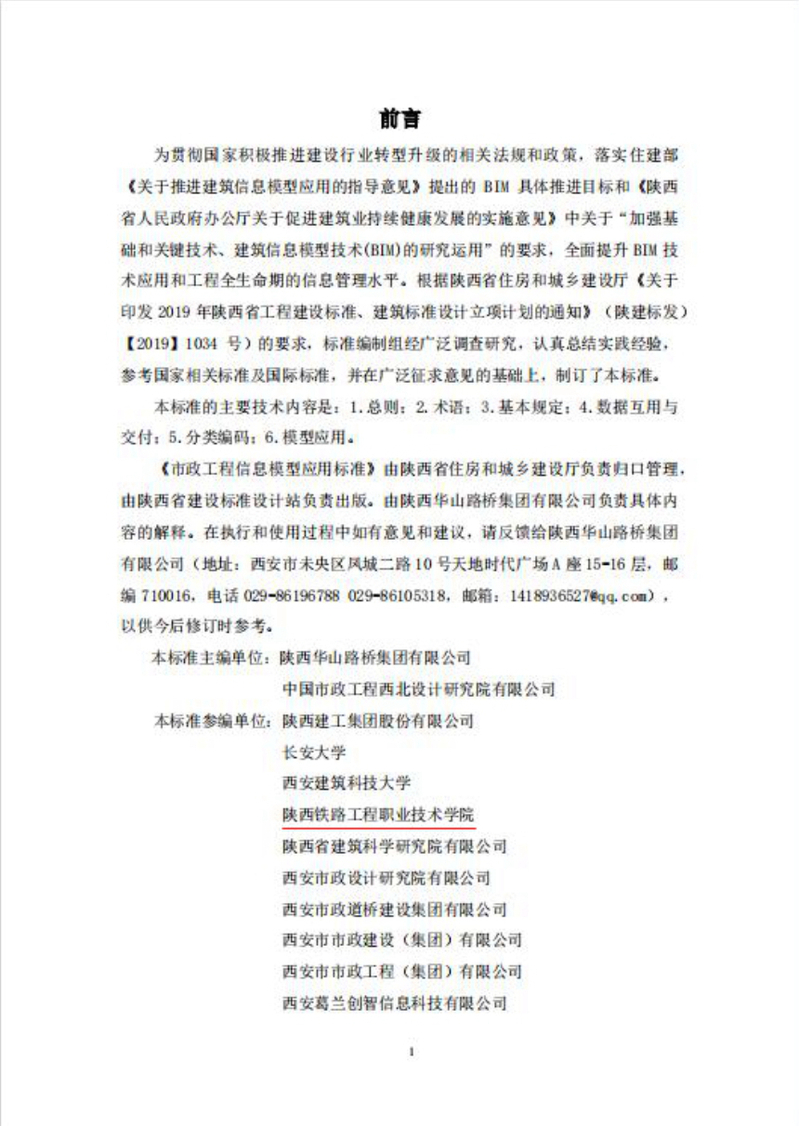 《市政工程信息模型应用标准》(陕建标发[2022]1004号)自2019年立项,历时两年多时间,由陕西建工集团、陕西铁路工程职业技术学院等12家单位共同参与编制。铁成(创新)学院(BIM技术应用研究中心)负责组织我校人员进行编写,副校长张学钢牵头编写团队完成了标准分类编码及模型应用的相关内容。该标准的发布实施将有力推进陕西省市政工程建设领域的BIM技术推广应用,有效助力建筑业迈向智能建造新时代。