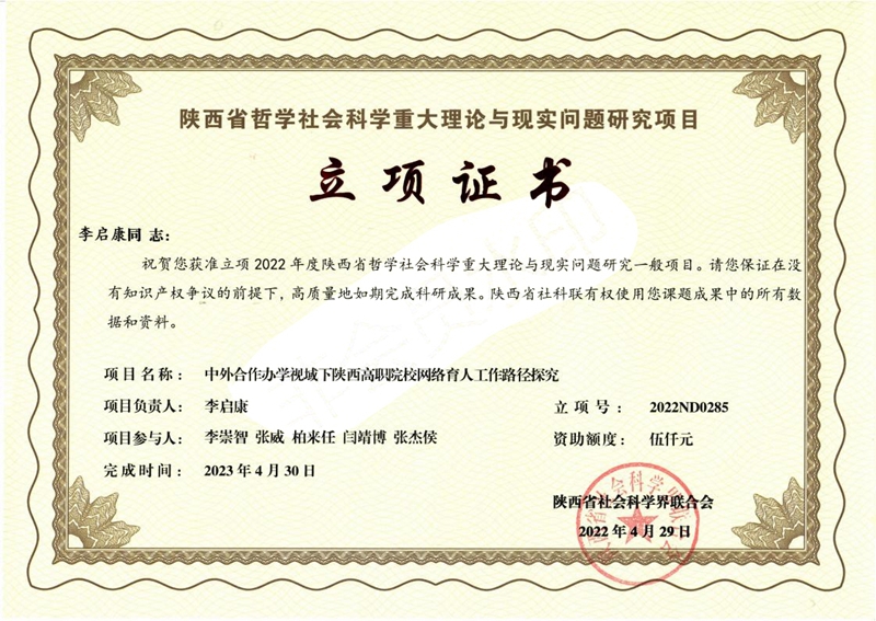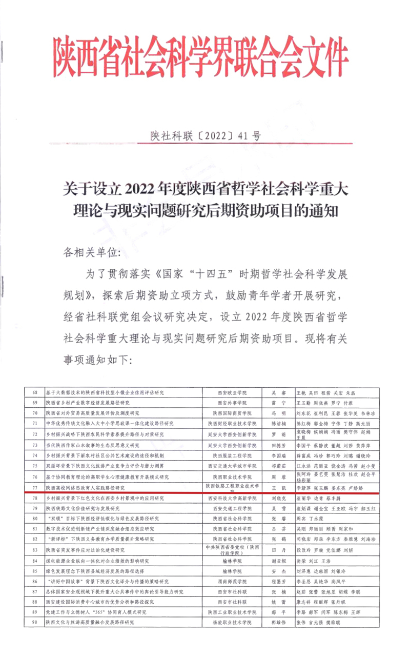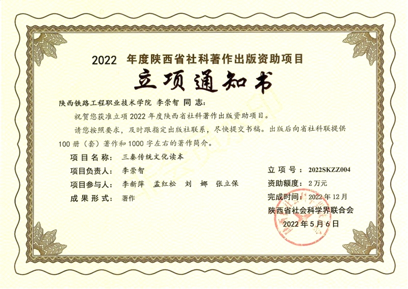 近日,陕西省社会科学界联合会公布了2022年度陕西省哲学社会科学重大理论与现实问题研究项目、后期资助项目、社科著作出版资助项目等相关立项文件,学校共计3项科研项目获批立项,获批支持经费2.5万元。其中李崇智博士主编的《三秦传统文化读本》获社科著作出版资助项目立项,李启康老师主持的《中外合作办学视域下陕西高职院校网络育人工作路径研究》获一般项目立项,王凯老师主持的《陕西高校网络思政育人实践路径研究》获后期资助项目立项。