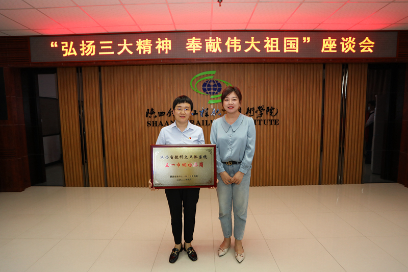 段梅梅副主任为陕西省教科文卫体工会-五一巾帼标兵岗~土木工程检测技术专业教学团队颁发奖牌