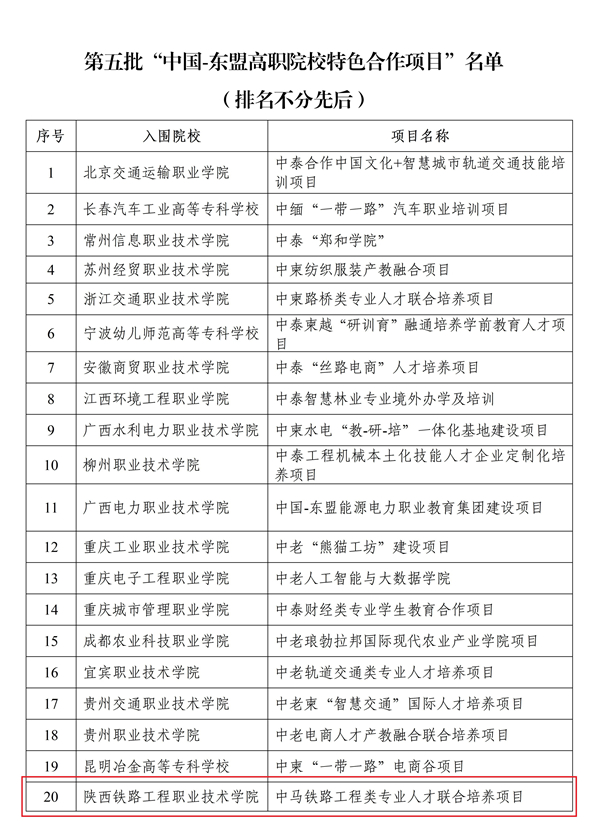 5月23日,中国教育国际交流协会公布了“中国—东盟高职院校特色合作项目”第五批入选名单,学校申报的“中马铁路工程类专业人才联合培养项目”成功入选,陕西省唯一。学校“中马铁路工程类专业人才联合培养项目”是响应国家“一带一路”倡议,服务中国高铁“走出去”的具体举措,也是学校国际化办学的重要成果之一。在项目后续推进中,学校将立足疫情常态化防控背景,联合马来西亚彭亨大学、吉隆坡建设大学抓好线上线下混合式教学,高质量完成人才培养工作,提升合作内涵与质量。
