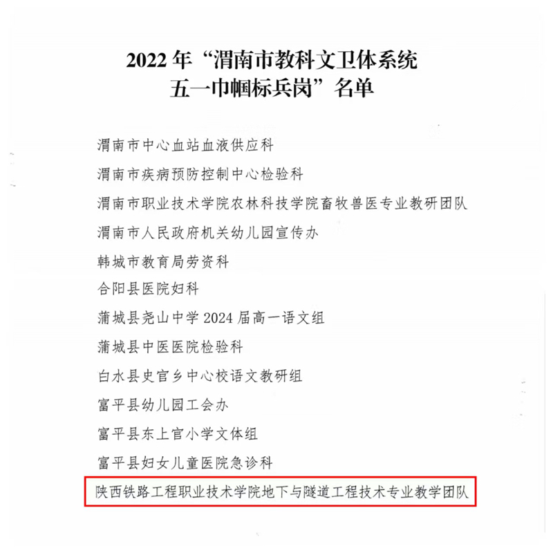 5月26日,渭南市教科文卫体工会委员会发布《关于表彰2022年渭南市教科文卫体系统五一巾帼标兵和标兵岗的通报》文件,学校城轨工程学院地下与隧道工程技术专业教学团队被授予“渭南市科教文卫体系统五一巾帼标兵岗”荣誉称号。