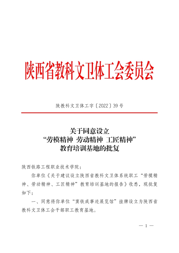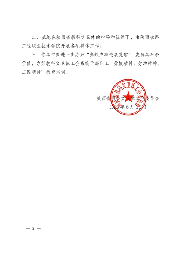 将“窦铁成事迹展览馆”挂牌设立为陕西省教科文卫体工会干部职工教育基地,旨在进一步发挥其社会价值,更好的服务教科文卫体工会干部职工“劳模精神、劳动精神、工匠精神”教育培训。