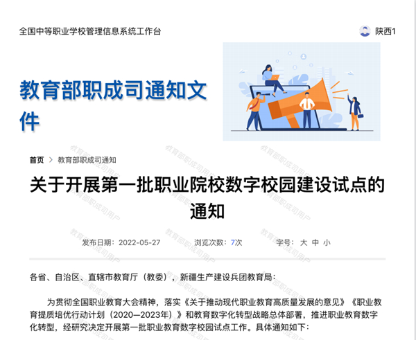 据悉,职业院校数字校园建设试点学校是教育部职成司为贯彻全国职业教育大会精神,推进 职业教育数字化转型,以参与“职业院校数字校园建设情况调研”的职业院校为基础,遴选出的一批办学基础较好、信息化水平较高的职业院校。