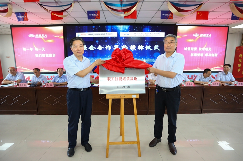 焦胜军校长与王永周总经理为“职工技能培训基地”揭牌