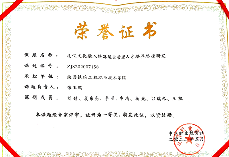 近日,中华职业教育社公布了《职业院校中华文明礼仪教育研究与实践》课题评审结果。由学校机关第一党总支书记、党委宣传部副部长张玉鹏同志主持,刘倩、姜东亮、杨光、吕瑞琴、王凯等教师,以及中共湖北省委党校社会与文化教研部副主任李明、中国铁路西安局集团公司党委宣传部副部长申琦参与完成的课题《礼仪文化融入铁路运营管理人才培养路径研究》(课题编号:ZJS202007158)顺利结题并获评一等奖。