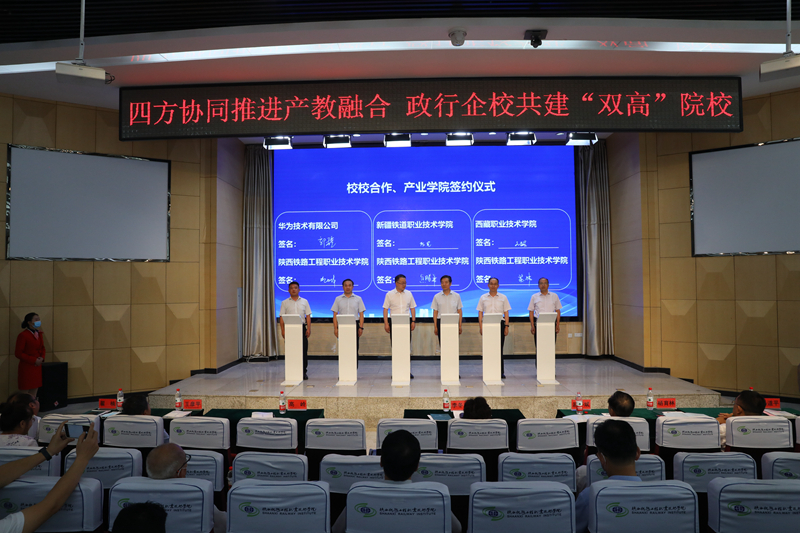 学校本着资源共享、优势互补、互动双赢、协同发展的原则,与国内高科技企业、西部职业院校建立了融洽的合作伙伴关系。新疆铁道职业技术学院校长陈光、学校校长焦胜军,西藏职业技术学院副校长庄世宏、学校党委副书记、纪委书记黎炜,华为陕西教育医疗业务总经理郭程、学校副校长贺建锋分别签署“校校携手合作,共育铁路人才,服务国家战略”合作协议和陕铁院-华为产业学院战略合作协议。