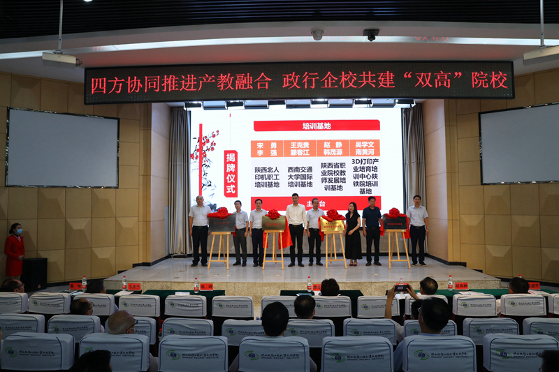 学校发挥自身专业优势,与多所学校和企业建立了良好合作关系,西南交通大学网络教育学院副院长王克贵、北京外国语大学外研培训中心西北大区总经理赵静、3D打印产业培育培训中心董事长吴学文、陕西北人印刷机械有限责任公司人事部部长宋勇与学校相关院部负责人分别为西南交大陕铁院国际培训基地、陕西省职业院校教师发展培训基地、3D打印产业培育培训中心陕铁院培训基地、陕西北人印机职工培训基地进行揭牌。
