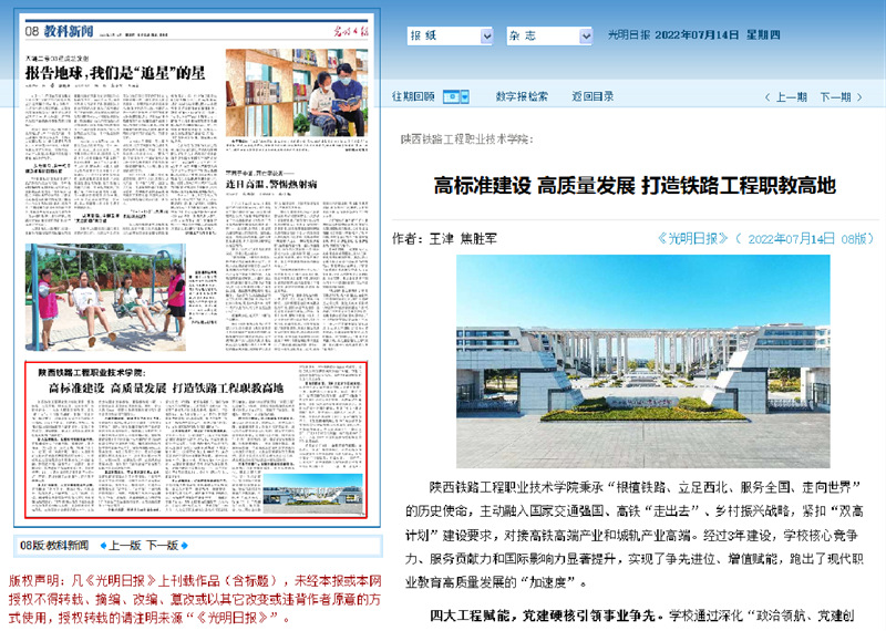 7月14日,《光明日报》科教新闻版刊发了学校党委书记王津、校长焦胜军的署名文章《高标准建设高质量发展打造铁路工程职教高地》。文章系统介绍了学校紧扣“双高计划”建设要求,紧紧围绕“一加强、四打造、五提升”十项改革发展任务,对接高铁高端产业和城轨产业高端,勇立潮头、奋楫扬帆,实现了争先进位、增值赋能。现将全文转载如下: