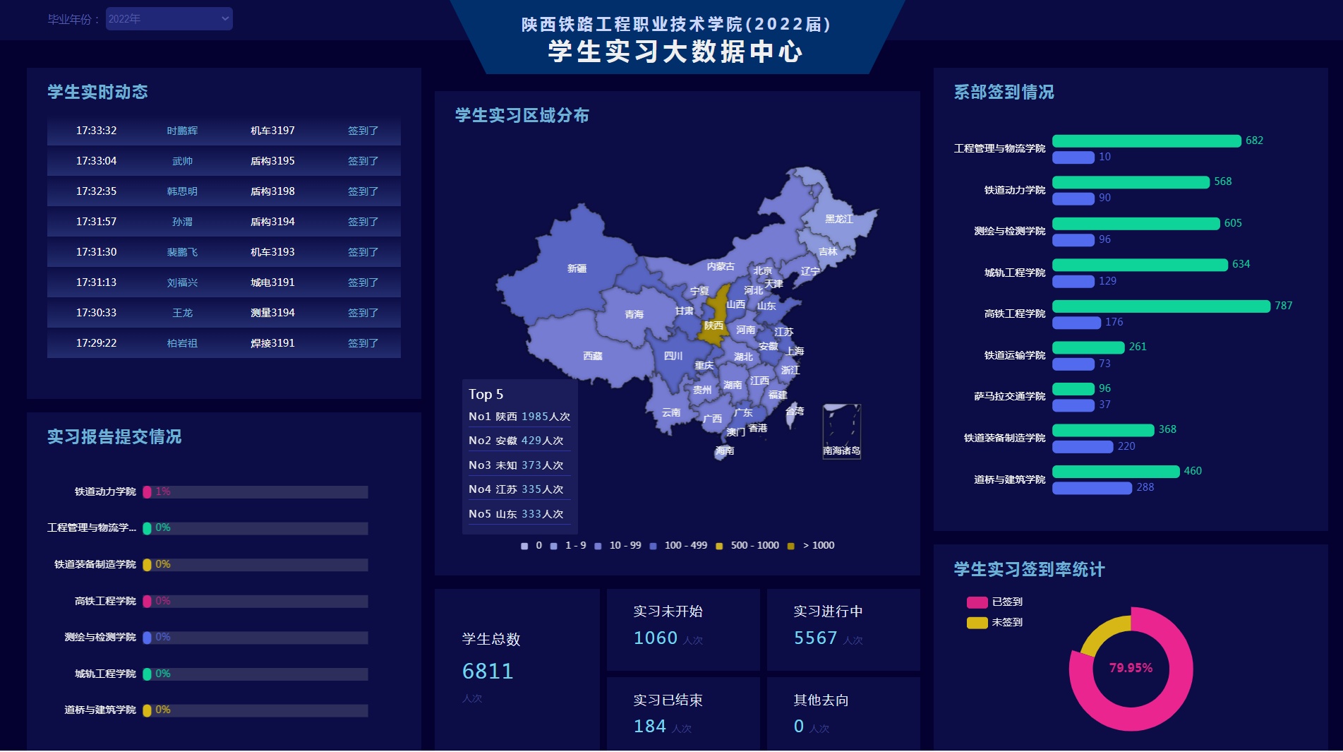 以前,学生实习实训在全国各地铁路建设单位,人数多、时间长、地点分散等特点,造成指导和管理难度大的问题。学校与企业合作开发了“习讯云”实习平台,教师可以实现网上实习审批、处理学生签到预警、监控学生是否在实习单位、批阅学生周报月报等。打开了实习的“黑匣子”,创立了学校“1-3-5”预警机制,实现了顶岗实习教学的可管可控。学校通过“三微两网一社区”融媒体平台,打造“出彩铁院人”网络思政育人品牌,在主要网络平台发出青年声音,凝聚青年力量;学校立足智慧职教平台,逐步形成了“一专多能”的特色艺术教育模式;还建设了学生管理系统、易班、PU口袋等“三维一体”的学生综合评价考核系统,从10个方面52个具体观测指标,对学生进行科学考核和评价。