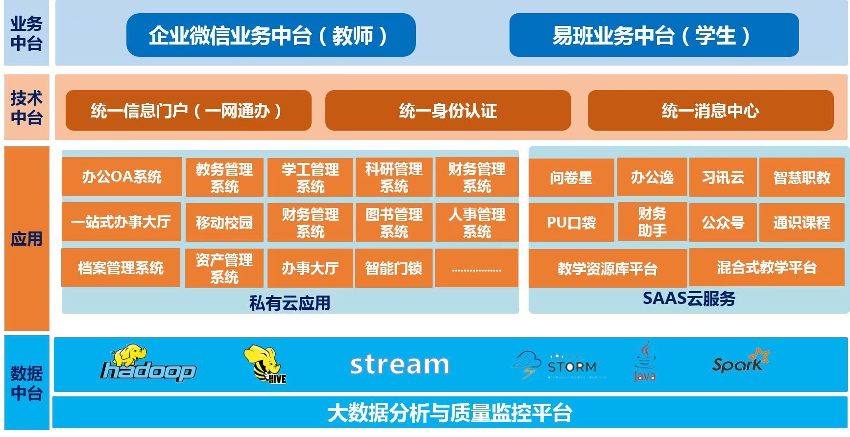 这只是搭建的众多应用之一。学校创造性地构建了“123+N”智慧校园混合云架构体系,以大数据分析和共享数据中心为基础,建成了1个“数据中台”,实现了数据的融合和治理;以企业微信和易班的开放架构为基础,建成了分别面向教师和学生的2个“应用中台”,实现了校园业务的一站式接入办理;以统一身份认证平台、一站式办事大厅、统一消息中心等3个“技术中台”为基础,实现了互联网应用和校内身份的透明融合,为师生提供一站式无感知服务技术基础,提升了用户的使用感受。通过一网通办平台进行业务整合,开发了130多个“微服务”信息化办事流程,实现了“让数据多跑路,让人少跑腿”的应用场景。