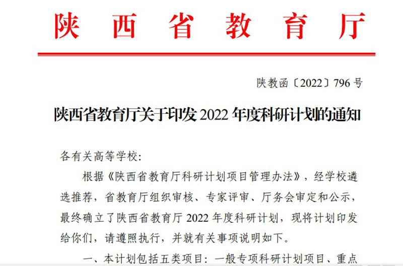 近日,陕西省教育厅公布了《关于印发2022年度科研计划的通知》(陕教函〔2022〕796 号),学校获2022自然科学科研计划项目5项,服务地方专项科研计划1项立项,共计获得20万元经费支持。