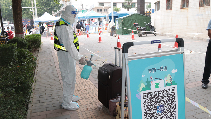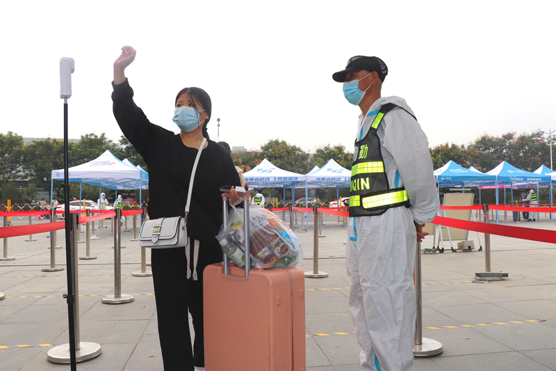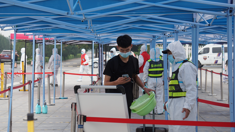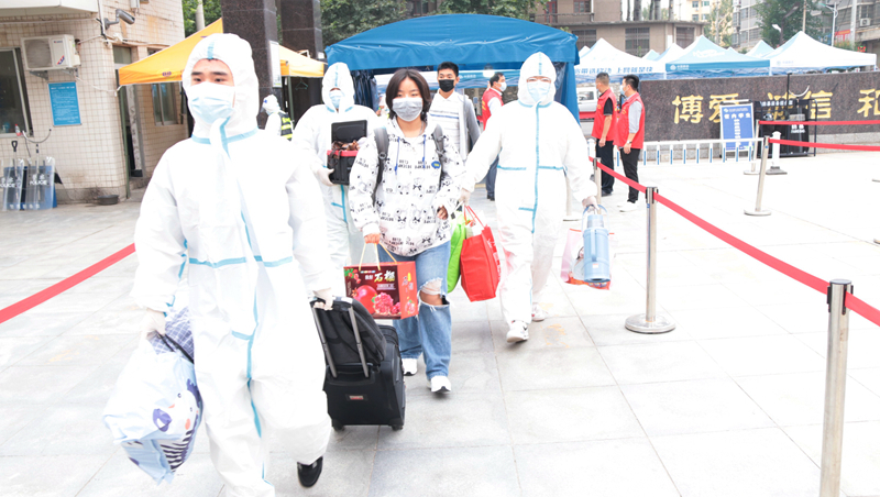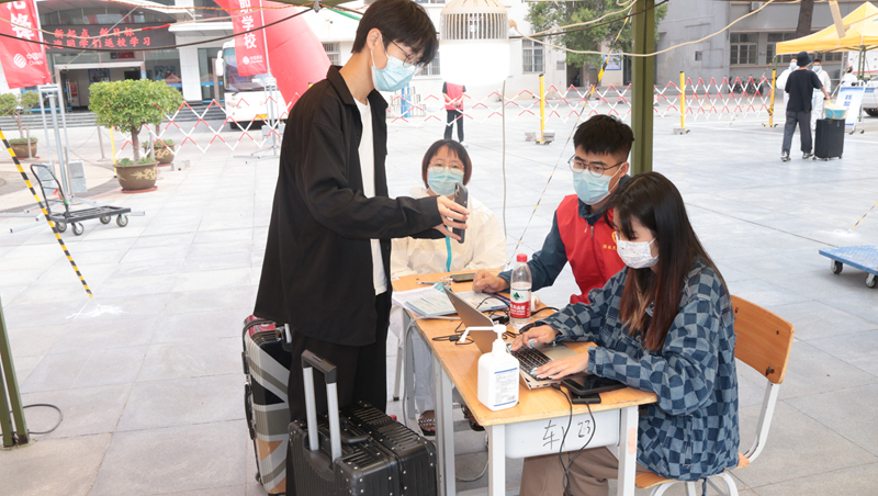 在两校区门口,返校学生佩戴口罩、自觉间隔一米排队,接受返校条件查验,对行李进行消毒,通过“一扫一测三查验”,即扫场所码,测温,查验健康码、行程卡、48小时内核酸检测阴性证明,入校登记,完成核酸检测,进入宿舍静态管理。整个流程科学安排,学生积极配合,秩序井然。