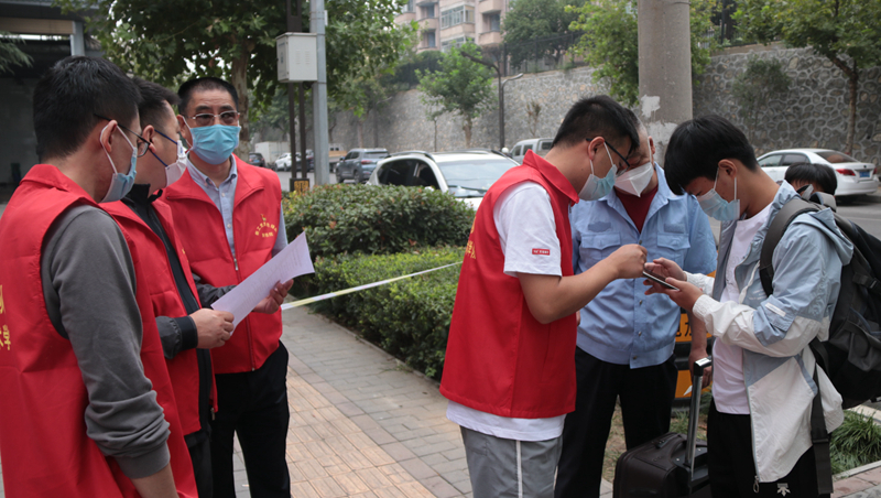 教工党员先锋队校门口查验学生学工系统返校审批手续