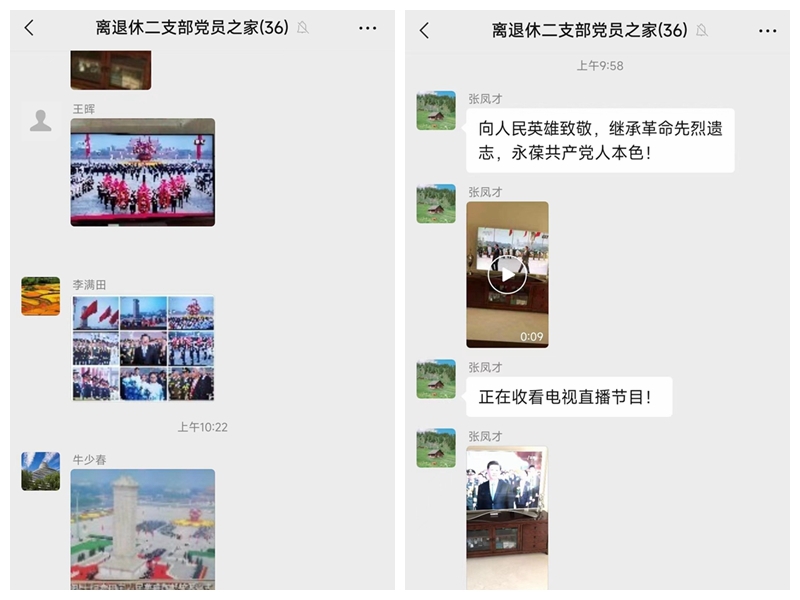 整个仪式庄严肃穆,观看过程中,离退休党总支全体党员深情缅怀革命烈士为实现民族独立、人民解放和国家富强、人民幸福立下的不朽功绩,同时在线上分享观后感想,纷纷表示一定要铭记历史,传承优良革命传统,坚定理想信念,谱写新时代壮丽凯歌。师生们心潮澎湃,表示在祖国母亲生日到来之际收看这次直播,既是对革命先烈的缅怀,也是对自己的激励,要学习人民英雄不畏牺牲、无私奉献的精神,要珍惜今天来之不易的幸福生活,在今后的学习工作中,恪尽职守,努力奋斗,为教育事业发展勇挑重担、砥砺前行,为祖国的繁荣昌盛贡献力量,以实际行动迎接党的二十大胜利召开!(蒋萌 麻建帅 张雯 杨志鹏 杨光 王高攀)