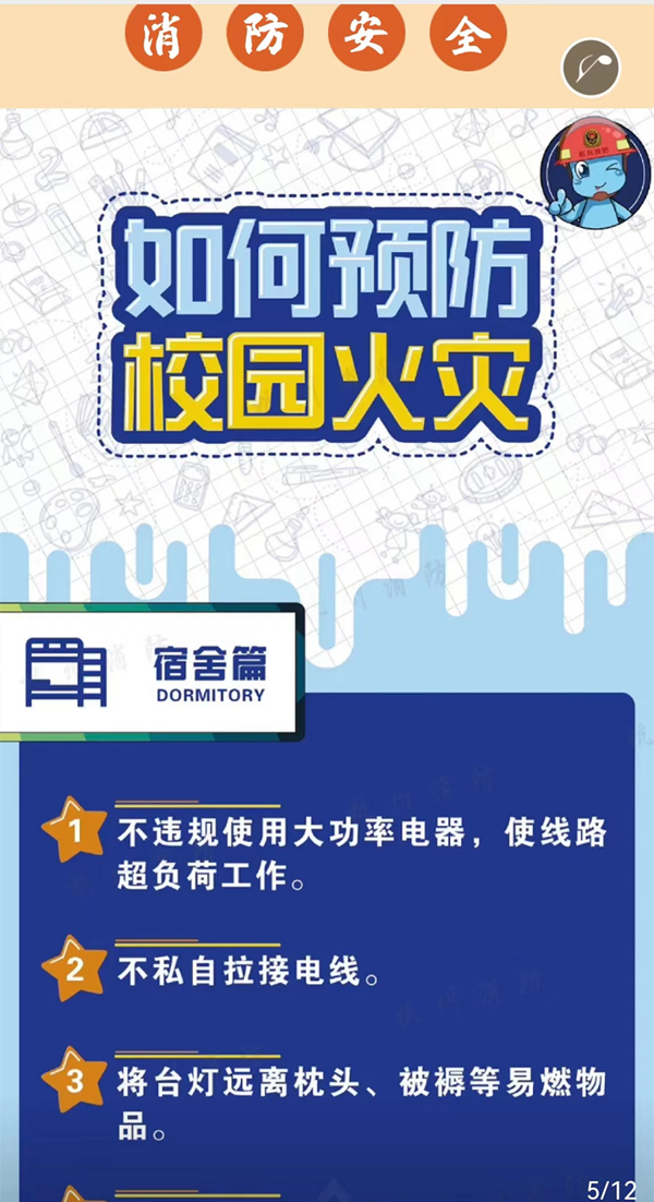 ——开展线上消防安全教育,防患于未“燃”。秋季学期学生返校后,根据疫情防控有关要求,从9月17日至23日,学校实行7天静态管理,所有学生在宿舍开展在线学习,进行日常活动。为切实抓好静态管理期间学生公寓消防安全管理工作,学校大力推动“消防安全在线课堂”,利用互联网不受地域限制优势,采用微信视频、腾讯会议等有效手段,分批次、分时段对学生开展线上消防安全教育,全面拧紧消防“安全阀”,坚决遏制火灾事故的发生,切实做到防疫防火两不误。(李鸿彬)