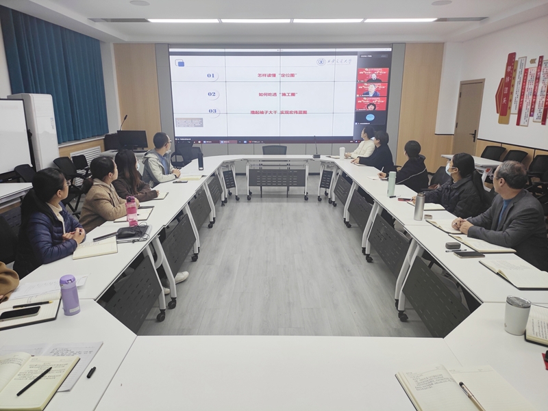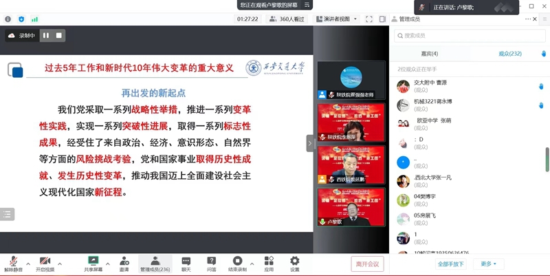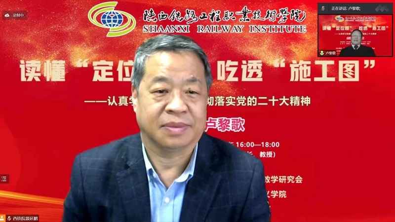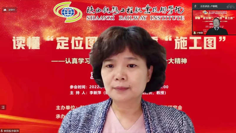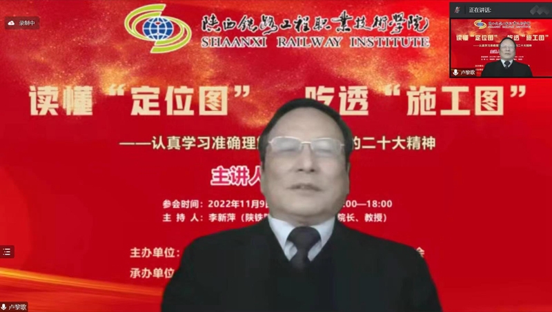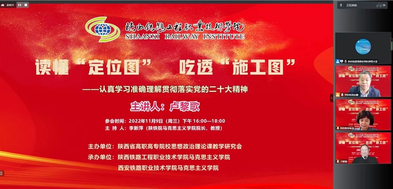 11月9日下午, “党的二十大精神主题报告会”在线上成功举办,本次会议由陕西省高职高专院校思想政治理论课教学研究会主办,陕西铁路工程职业技术学院马克思主义学院、西安铁路职业技术学院马克思主义学院共同承办。会议邀请到了西安交通大学马克思主义学院二级教授、博士生导师卢黎歌,作了题为“读懂‘定位图’ 吃透‘施工图’——认真学习准确理解贯彻落实党的二十大精神”的主题报告。陕西省高职高专思政课教学研究会副会长、学校马克思主义学院院长李新萍教授主持会议,陕西省高职高专思政课教学研究会副会长、西铁职院马克思主义学院院长景延鹏出席并发言。会议吸引了省内省外、线上线下共22所高校及单位、260余名思政教师热情参与。