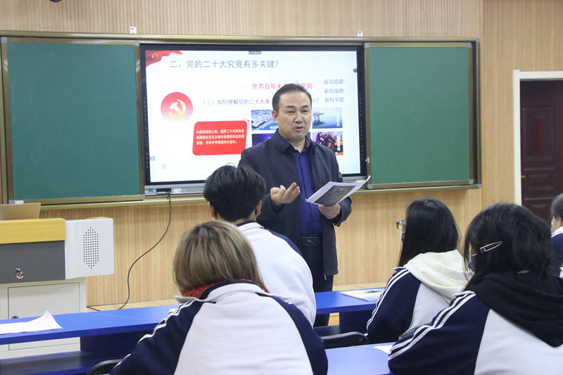 课堂上,贺建锋带领学生回顾了中国共产党历次全国代表大会的时间及贡献,引导学生充分认识党的全国代表大会对于党和国家的重要性。以问题为导向,从“党的二十大究竟有多关键,党的二十大召开面临什么样的重大国内国际背景,党的二十大如何擘画未来、谋篇布局,如何学习贯彻落实党的二十大精神”四个方面为同学们全面解读党的二十大相关内容。最后,他引用习近平总书记在党的二十大报告中对青年的寄语,鼓励青年学生要坚定不移听党话、跟党走,怀抱梦想又脚踏实地,敢想敢为又善作善成,立志做有理想、敢担当、能吃苦、肯奋斗的新时代好青年。