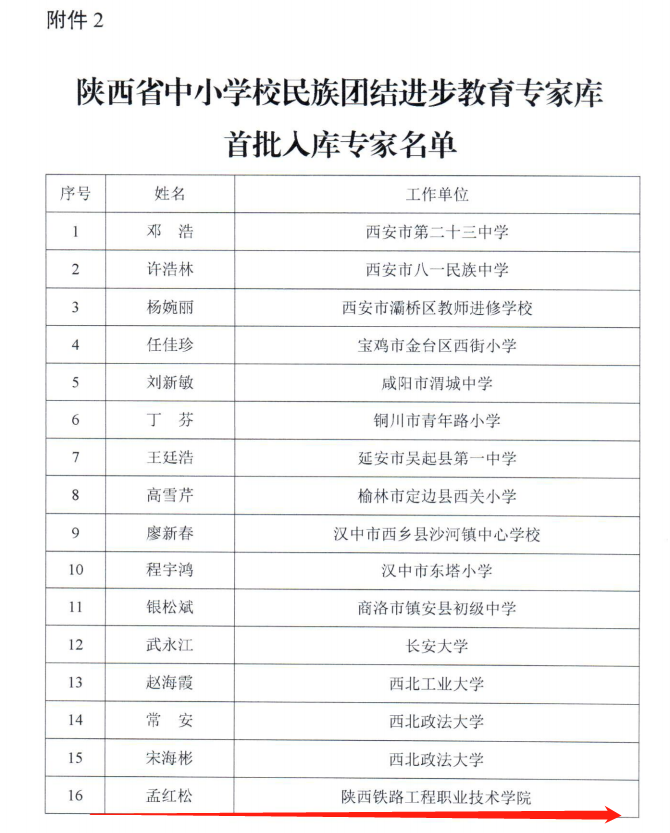 11月16日,陕西省教育厅下发了《关于公布陕西省融合教育专家库和中小学校民族团结进步教育专家库首批入库专家名单的通知》,学校孟红松博士入选陕西省首批中小学校民族团结进步教育专家库。