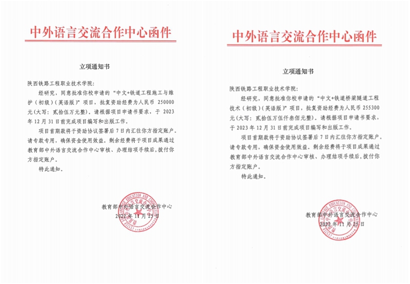 为配合国家职业教育“走出去”,有效缓解“中文+职业技能”教学资源短缺情况,教育部中外语言交流合作中心(语合中心)启动了2022年度首批“中文+职业技能”教学资源建设项目工作。11月25日,语合中心公布项目立项名单,并划拨专项经费用于项目建设。学校申报的“中文+铁道工程施工与维护(初级)(英语版)”“中文+铁道桥梁隧道工程技术(初级)(英语版)”2个项目榜上有名。本次2个项目立项建设是学校高质量推进“双高”建设,打造国际合作办学新标杆的又一重要成果。